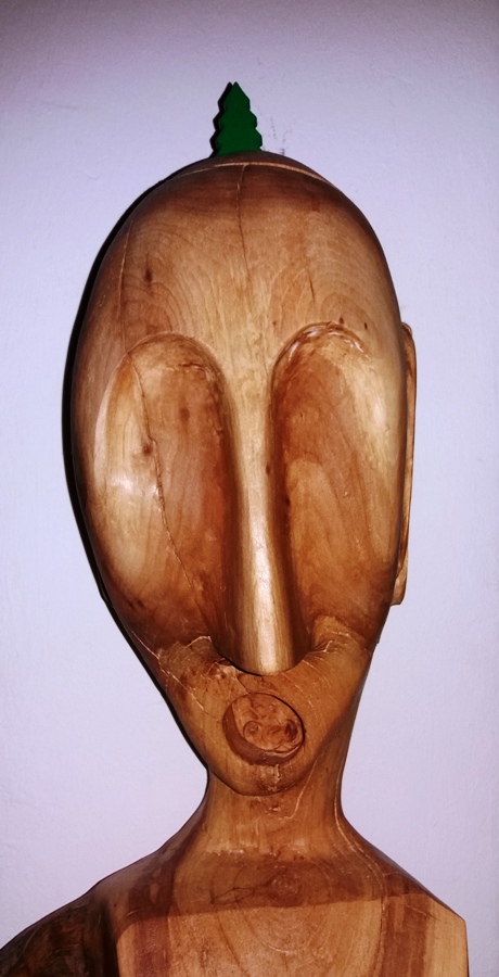 Das rote Buch hat es mir angetan. Das habe ich mir genauer angesehen. pitty hat mir erzählt, dass darin das Holzwerk von Regloh präsentiert wird. Das fand ich spannend. pitty hat mich dann doch noch durch die Wohnung geführt und die vielen, vielen Skulpturen vorgestellt. Mit Priapos bin ich ins Gespräch gekommen. Er hat eine wirklich bewegte Geschichte. Er hat ein Selfie von uns gemacht: