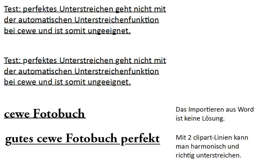 Linien sind selten notwendig, vielfach kann man darauf verzichten. Sie haben schmückenden Charakter. Ich empfehle, eine Seite mit und ohne Linien zu gestalten und zu vergleichen. Sieht die Seite ohne mindestens ebenso gut aus wie die mit, dann lasst die Linien weg. Soll Text unterstrichen werden, ist die cewe Textfunktion nicht zu gebrauchen. Ich empfehle, nur Titel oder Überschriften zu unterstreichen und dabei als Linie manuell herzustellen. Linien übernehmen stützende oder führende Aufgaben, sie dürfen daher nicht zu sehr in den Vordergrund treten. Sie müssen sich in der Liniendicke dem Foto, Bild, Text, Schrift unterordnen bzw. harmonisch anpassen. Die einfache durchgehende Linie ist die am wenigsten auffällige. Andere springen ins Auge: gestrichelt, punktiert, gewellt ... und werden beim (zu) vielfachen Einsatz schon mal störend oder "nutzen sich ab". Siehe auch: http://www.cewe-community.com/forum/vie ... nie#p94525 http://www.cewe-community.com/forum/vie ... nie#p94717 Lieber Gruß, pitty