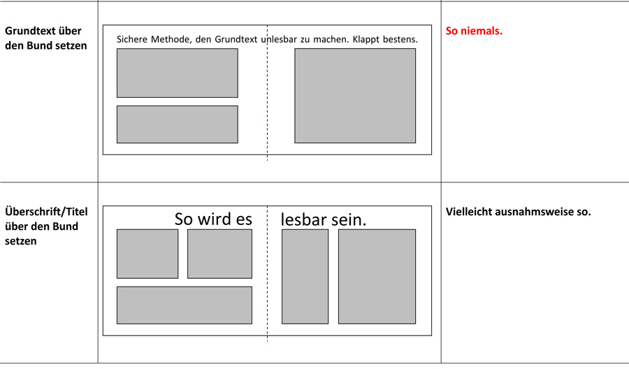 Die richtige Zeilenlänge oder Satzbreite zu finden, fällt vielen schwer. Der Lesegenuss wird getrübt, wenn das Auge strapaziert wird: Oft in Kundenbeispielen gesehen habe ich Grundtext, der ohne Not über den Bund gesetzt wird. Auch bei der Layflat-Bindung rate ich davon ab, denn es ist weder gut lesbar noch chic. Es gibt jedenfalls reichlich andere Möglichkeiten. Titel und Überschriften kann man über den Bund setzen, sofern kein Wort im Bund sitzt. Ein Mittel zu lange Zeilen im Fotobuch nachträglich zu korrigieren: