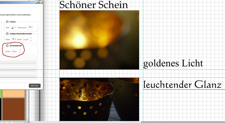 Ein Thema, das nicht nur Weihnachten wichtig ist (siehe Rudolph in Rotwein) und an dem auch Vegetarier nicht vorbeikommen. Das Vorfleisch muss (manchmal) weg: Das Rezept und die Regeln für das Fleisch sind umfangreich: Hier die Bedeutung, die Fleisch und Ober- und Unterlängen für die Titel- und Überschriftengestaltung bei cewe haben: Obwohl die Texteigenschaften auf "Innenabstand = 0" eingestellt ist, lässt sich der Text trotz Fangfunktion (Hufeisen) am Seitenraster bzw. an Foto oder clipart nicht exakt bündig ausrichten. Das liegt am Vorfleisch. Analog dazu würde eine rechtsbündige Ausrichtung des Texts am Nachfleisch scheitern. Auch lassen sich Textzeilen weder oben noch unten passgenau setzen. Ich empfehle, die Textzeilen manuell mit den Pfeiltasten und nach Augenmaß auszurichten. Dabei sollten die Ober- und Unterlängen über den Bildrand herausragen. Das ist je nach Schriftart unterschiedlich. Die optische Wirkung ist entscheidend - probiert es aus. Auch die Unter- und Oberlängen sollten zumindest herausragend beseitigt werden: Lieber Gruß, pitty