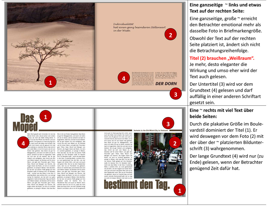 Die Feststellung in ein Fotobuch gehören Fotos ist genauso aussagekräftig wie Äpfel sind die Grundzutat zu einem Apfelkuchen. Ich möchte hier keine Eulen nach Athen tragen, sondern die Bedeutung herausstreichen, die eine gekonnte Anordnung von Text und Foto auf einer Seite haben. Mit den Erkenntnissen des visuellen Orientierungsverhaltens der Betrachter kann man sein Fotobuch zielgerichtet layouten. Inspirationen gibt es genug in der Werbung oder bei Reisebüchern und Bildbänden. Die eigene Analyse, warum (mir) das eine oder andere gut gefällt bzw. warum (auf mich) das eine oder andere überhaupt nicht wirkt, verhilft zu eigenen zielgerichteten Exponaten. Beachtenswert ist die optisch geführte Mittelachse, an der sich Text und die Tänzerin ausrichten. Der Text wird zuerst gelesen und durch den absurden Inhalt beachtet. Sofort liest der Betrachter den kleinen Text. Erst danach wird das werbeträchtige Foto betrachtet. Beachtenswert ist der großzügige Weißraum um Text und Abbildung – nur so kommt die Botschaft an. Im Folgenden nur einige Beispiele, wie Text und Abbildung in Bezug zueinander stehen können und welche Emotionen sie bei dem Betrachter auslösen. Es gibt natürlich weitaus mehr... Beim traditionellen Layout stehen Titel und Text links oben beim Lesebeginn. Je weiter man von diesen Gewohnheiten abrückt, umso auffälliger wird die Gestaltung. Aufpassen muss man jedoch, dass das Schema noch klar erkannt und gelesen werden kann. (Abbildungen und Layouts von pitty). Lieber Gruß, pitty