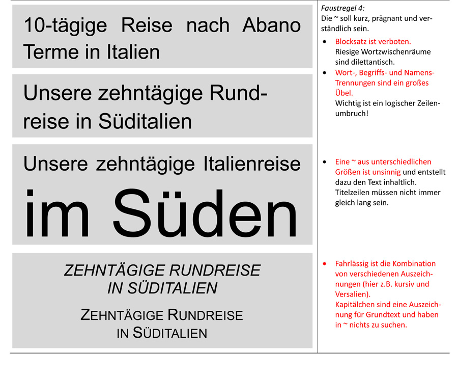Text senkrecht zu schreiben, ist in Kreuzworträtseln eine Notwendigkeit. Bei Logos, Signets und zur Fassadengestaltung mag es gestalterisch erforderlich sein. Senkrecht untereinander gesetzter Text ist nicht gut lesbar. In unserem Kulturkreis haben wir gelernt, von links nach rechts zu lesen und zeilenweise von oben nach unten. Einen Buchtitel kann natürlich auch (einmal) von oben nach unten gesetzt werden. Ich möchte den Titel jedoch nicht gerne »entziffern«, wenn das Reiseziel Fuerteventura oder Papua-Neuguinea ist oder gar in Schreibschrift geschrieben wird. Wir wissen, wie gravierend es ist, den Haupttitel ansprechend zu gestalten – ist er doch nach den Abbildungen das Wichtigste auf der Seite. Es gilt, den Betrachter anzulocken. Bei aller Kreativität gilt es, das Augenmaß nicht zu verlieren, damit auch der Inhalt ankommt. Genauso wie bei dem vorherigen Beitrag, ist es unmöglich, das »richtige« Gestaltungskonzept zu propagieren. Ich möchte statt dessen auf Dinge hinweisen, die auf der »schwarzen Liste« der Typografie stehen. Fortsetzung folgt. Lieber Gruß, pitty
