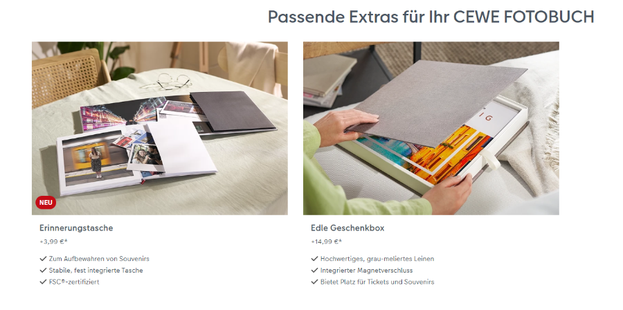 Zudem sind die Grußkarten jetzt auch ohne Umschläge bestellbar Was gibt es beim CEWE FOTOBUCH Neues? Farbige Einband-Innenseiten beim CEWE FOTOBUCH mit Fotopapier Die Einband-Innenseiten könnt ihr jetzt farblich an eure Gestaltung anpassen, wenn ihr euch für ein CEWE FOTOBUCH mit Fotopapier entscheidet. Erinnerungstasche in Schwarz und Weiß für das CEWE FOTOBUCH mit Fotopapier (kommt erst in ein paar Wochen) Geschenkverpackung Nach der weihnachtlichen Geschenkverpackung für das CEWE FOTOBUCH, gibt es nun auch eine Geschenkverpackung, die sich außerhalb der Weihnachtszeit einsetzen lässt. Wandkalender Fineline Den Wandkalender Fineline bieten wir zwar schon seit letzten Jahr an, jedoch ist er jetzt auch in der Software bestellbar und kann auch ohne die Wandhalterung bestellt werden. Adventskalender zum Selbstbefüllen mit 24 kleinen Faltschachteln, die individuell gestalt- und befüllbar sind