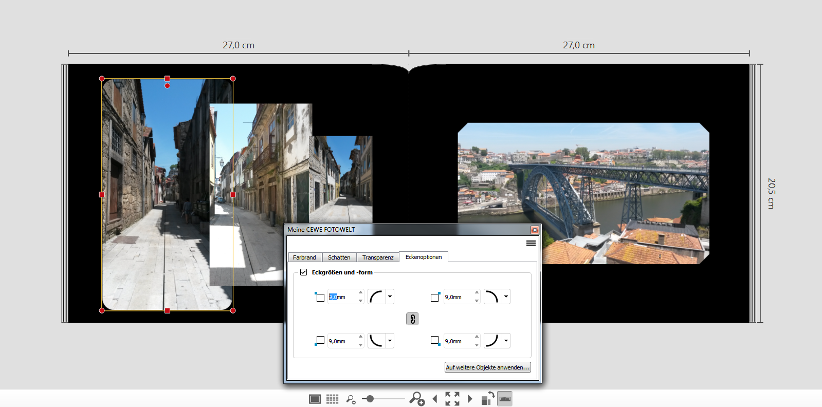 War es bisher in der Bestellsoftware nur möglich, die Bildecken mithilfe der entsprechenden Formen-Maske abzurunden, kommen nun weitere 5 Möglichkeiten, die Größen und Formen von Ecken zu definieren, hinzu. Verbargen sich unter dem Menüpunkt „Dekoration“ u.a. bisher die Ihnen bereits bekannten 3 Funktionen zum Editieren des Farbrandes, des Schattens und der Transparenz, erscheint nun zusätzlich der Reiter „Eckenoptionen“.