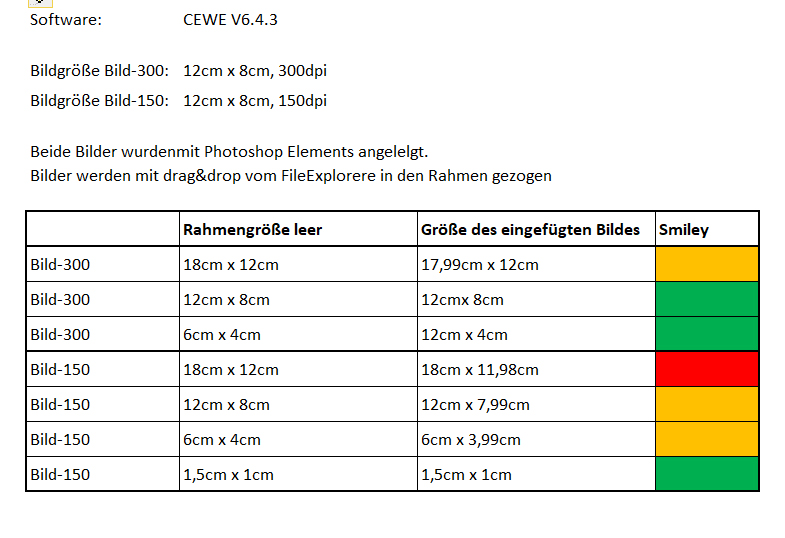 Ich habe ein Bild 12*8 einmal mit 300dpi und einmal mit 150 dpi angelegt und in 3 bzw. 4 unterschiedlich große Rahmen eingefügt.Weiter habe ich eine jpeg-Datei erstellt mit einem Foto, welches folgende Maße hat: Breite = 12 cm, Höhe = 8 cm (also ebenfalls Querformat) und einer Auflösung von 300 dpi. ... Was, darf ich erwarten, passiert, wenn ich dieses Foto in den o.g. Platzhalter ziehe, wobei die Option Optionen / Einstellungen... / Fotos /Verhalten beim Einfügen von Fotos / Fotobücher den Wert "Größe des Platzhalters verändern, so dass Foto den Rahmen optimal füllt" hat?? ... Alle Mitleser sind aufgefordert, diese Situation nachzustellen und ihre Ergbnisse zu posten (bitte Version des Programms, Maße von Platzhalter und Foto sowie Farbe des Smileys angeben). Hier meine Ergebnisse: 1a) Die Einstellung sagt " .... so dass der Rahmen optimal ..." gefüllt wird. So lange "optimal" nicht näher spezifiziert ist, ist fast alles richtig. Insofern liegt formal kein Fehler vor. 1b) Nach intensiver Beschäftigung mit dem Thema (infolge dieser Beiträge) würde ich mir wünschen, dass das resultierende Bild die gleiche dpi hat, wie mein Originalbild; das funktioniert, wenn ich das Bild nur proportional ändern muss. Ich habe micht aber nicht damit beschäftigt, wie sich das ausgeht, wenn ich ein hochformatiges Bild in einen querformatigen Rahmen einhänge. 1c) Vielleicht bräuchte man eine 3.Option "mit Originaldimensionen" übernehmen, wo der Rahmen dann nur mehr den Ankerpunkt definiert (z.b. Linke untere Ecke oder Mittelpunkt) und das Bild einfach mit den Original-dpi übernommen wird.. 2) Dass sich die Rahmengröße ändert, wenn ein gleichgroßes Bild eingefügt wird, sollte m.E. nicht sein (Bild-150 mit Rahmen 12x8). 3) Auch überrascht mich, dass Bild-150 in einem 6x4 Rahmen immer noch nicht ein grünes Smiley ergibt. Re: Platzhalter passt sich nicht anHallo grasmuecke,