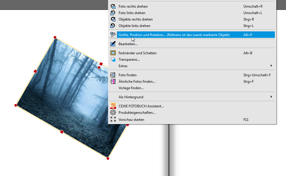 Neben diesem freien Drehen können Sie jedoch auch einen festen Wert eingeben. Die Möglichkeit hierfür finden Sie über das Kontextmenü und den Punkt „Größe, Position und Rotation“.