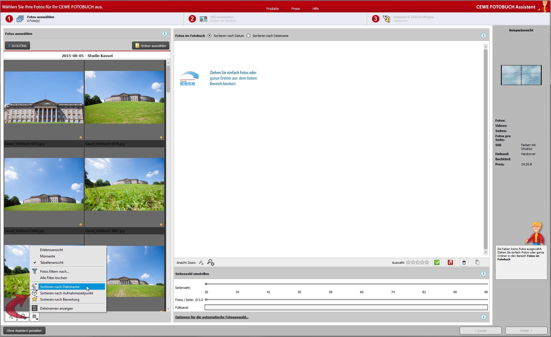 der geöffnete Programmbereich ist nur relevant, wenn z.B. nicht alle Bilder im CEWE FOTOBUCH übernommen werden können. Sei es, weil du eine zu geringere Seitenanzahl oder Bildverteilung auf den Seiten gewählt hast. Mit der Auswahl gibst du dem Assistenten die Möglichkeit, bevorzugt Bilder mit dem gewählten Kriterium zu übernehmen. Mit der Sortierung, hat dieser Bereich nichts zu tun. hat geschrieben: Ich habe es jetzt nochmals getestet, diverse Fotos mit verschiedenem Datum alphabetisch umbenannt. Da waren einige Fotos durcheinander, aber nicht immer nach Datum, kann nicht wirklich ein System dahinter sehen.