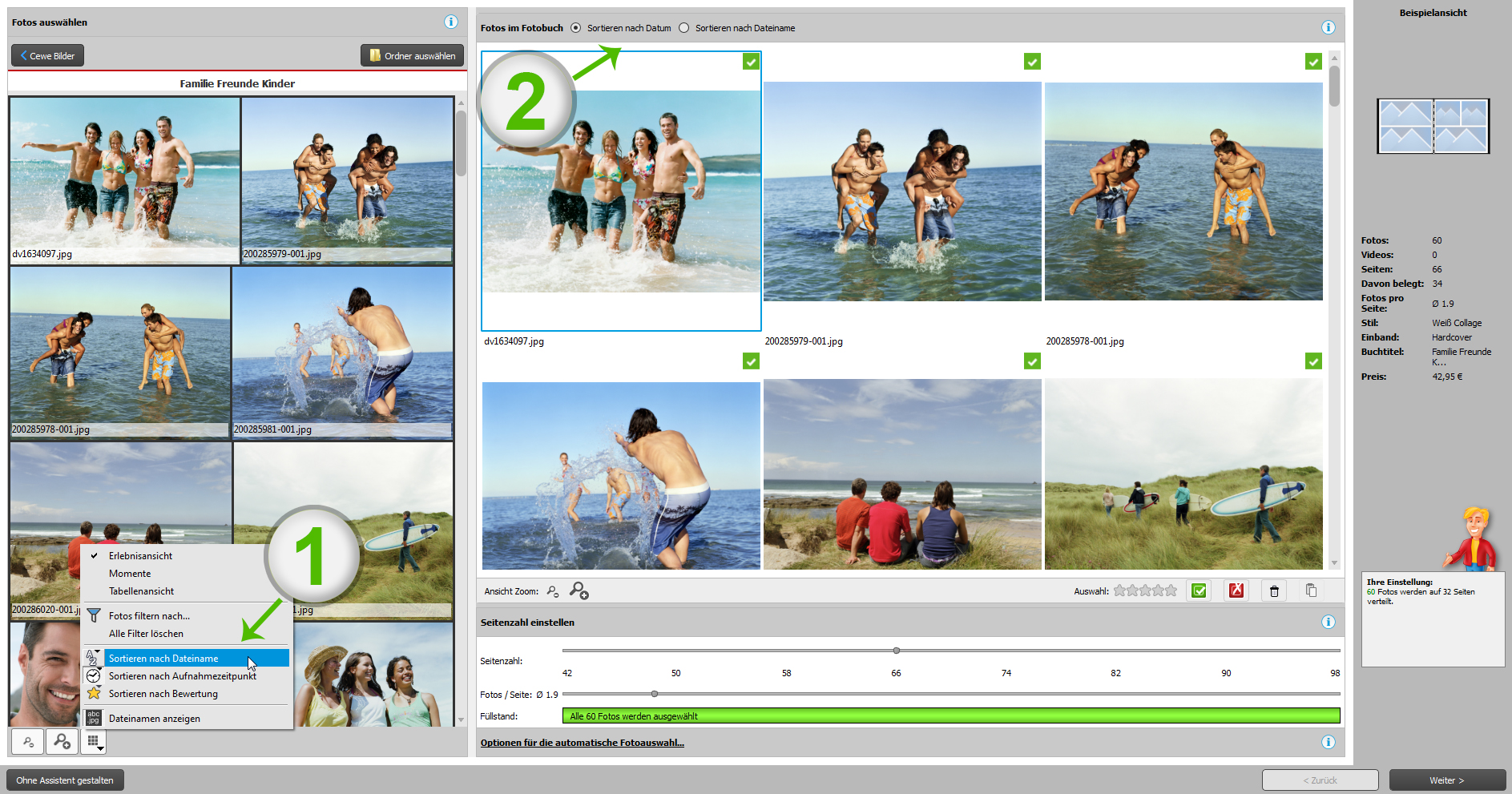 vielen Dank für Ihren Hinweis! Ich habe mir das beschriebene Verhalten in der 6.1.5. angesehen. Für meinen Test habe ich unterschiedliche Bildverzeichnisse herangezogen - Bilder die mit verschiedenen Kameras aufgenommen wurden und unterschiedliche Exif-Daten enthalten. In den meisten Fällen wurden die Bilder wie erwartet eingefügt und entsprachen der chronologischen Reihenfolge. Nur bei einem Verzeichnis wurden zwei Bilder falsch einsortiert. Unsere Recherche ergab, dass Bilder ohne Aufnahmedatum im CEWE FOTOBUCH vorangestellt werden. Meine Kollegen haben das Regelwerk heute überarbeitet und stellen diese Lösung mit der nächsten Softwareversion zur Verfügung. Können Sie unsere Beobachtungen bestätigen? Verfügen alle Dateien über ein Aufnahmedatum in den Exif-Daten oder fehlt dieses teilweise? Eine Lösung kann sein, dass Sie das Aufnahmedatum bei den betroffenen Bildern nachpflegen. Sollten mehrere Bilder betroffen sein, lohnt sich ggf. die Stapelfunktion Ihrer Bildbearbeitungs- oder Bildverwaltungssoftware. Für mein Verständnis, damit ich nichts übersehe - welche Einstellung haben Sie in der Bildauswahl (1) und im Assistentenbereich (2) eingestellt? Sylke Re: Foto-sortierung mit AssistentIch habe es jetzt nochmals getestet, diverse Fotos mit verschiedenem Datum alphabetisch umbenannt. Da waren einige Fotos durcheinander, aber nicht immer nach Datum, kann nicht wirklich ein System dahinter sehen. Dann gibt es noch die Einstellung, ob die besten Fotos bevorzugt werden sollen. Muß man dafür Sterne vergeben, oder was versteht man darunter. Wenn ich die Fotos nach Dateinamen sortiert eingefügt haben möchte, möchte ich doch nicht nur die besten?
