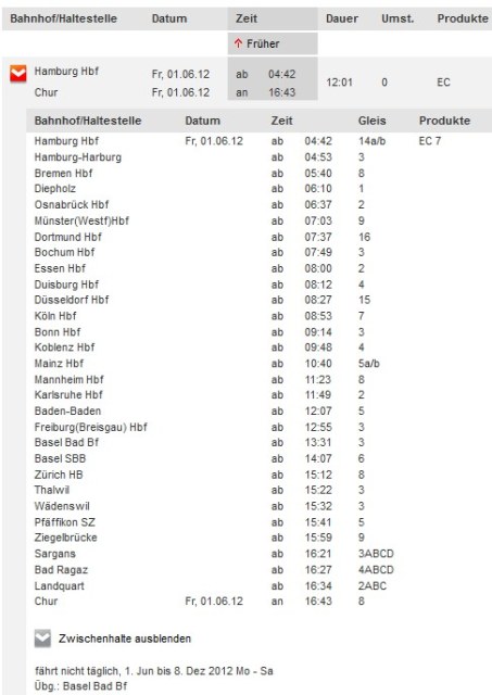 Ich hab' mir ganz simpel in der DB-Fahrplanauskunft den Zuglauf des EC 7 (HH --> Chur mit Einblendung der Zwischenhalte) angschaut: