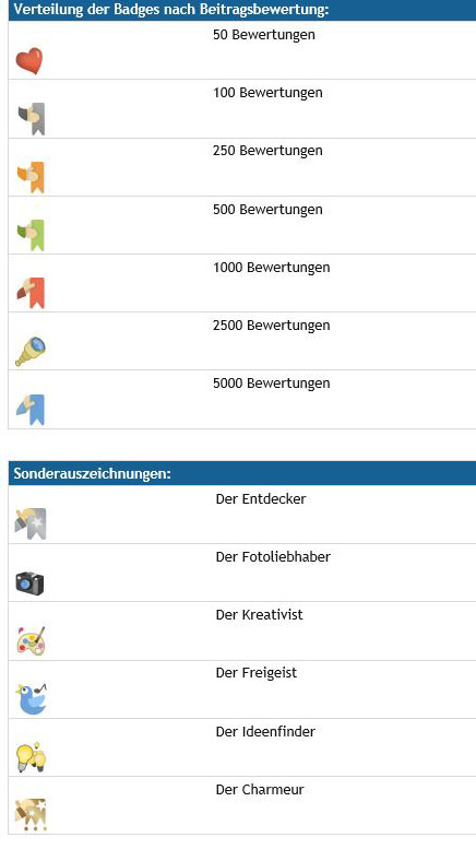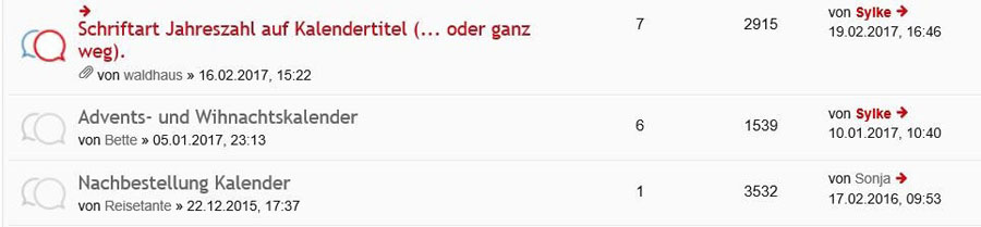 Vieles war mir die ganzen Jahre über unklar, hat mich aber auch nicht so bewegt, dass ich nach Antworten gesucht hätte. Ich fand es einfach unglaublich toll, wie viele Mitglieder sich in diesem Forum ausgesprochen intensiv engagieren, kreative Beiträge leisten, unendlich geduldig Fragen zu allen möglichen Themen beantworten, interessante Möglichkeiten zu Fotografie und Gestaltung aufzeigen, technische Details erklären etc.. Nun sind mir bei näherer Beschäftigung mit den Geheimnissen dieses Forums viele Funktionen erst bewusst geworden und ich bedaure etwas, diese vorher nicht gekannt zu haben. Aus diesem Grund habe ich mich entschieden, für alle Neulinge hier eine kleine Einführung zu posten. Sie ist ganz sicher nicht vollständig, aber wenn Du weitere Fragen hast, registriere Dich als Mitglied, hier „wirst Du ganz sicher geholfen“ *. (* Zitat frei nach Verona Pooth in einem Werbeclip.) Hier also vorab einige Infos: Aufbau des Forums Du siehst auf der Startseite eine Übersicht aller Themen nach Kategorien geordnet: Klickst Du auf den linken Button, erscheint die Übersicht des Unterordners zu diesem Thema (hier am Bp. "Fotokalender") nach Aktualität sortiert: In der Übersicht rechts ist ein Link zum aktuellsten Beitrag, der zu einem der Unterthemen gepostet wurde. Hier kommst Du direkt zu diesem Beitrag im entsprechenden Unterordner: In diesem Beitrag hast Du nun auch gleich Sylke kennengelernt. Sie ist die Administratorin dieses Forums. Die unteren Buttons bei diesem Beispiel sind grau was bedeutet, dass ich diese Themen komplett gelesen habe. Eigene Themen eröffnen, eigene Beiträge posten Dies kannst Du nur, wenn Du Dich als Mitglied registriert hast! Weitere Informationen zur Mitgliedschaft, Nutzungsbedingungen und Regeln dieses Forums findest Du in der Übersicht ganz oben in der Kategorie „Bekanntmachungen“ unter dem Thema „Netiquette“ Wenn Du als Mitglied registriert bist, öffnet sich ganz unten in der Forums-Übersicht eine neue Kategorie: „Board-Informationen“. Hier findest Du unter der Kategorie „Bekanntmachungen“ u. A. auch ausführliche Infos zum Erstellen von Beiträgen. Persönlicher Bereich Insider-Infos Unter dem Button „Board-Informationen“ findest Du nun weitere Insider-Informationen, wie z.B. die Kennung der Mitglieder nach ihrem aktuellen Status. Neben den Moderatoren und Administratoren haben die „Gurus“ in diesem Forum einen besonderen Status. Sie sind an der orangenen Farbe ihres Namens zu erkennen: Aber auch die "normalen" Der Status bezieht sich auf die Anzahl ihrer Beiträge und die Bewertungen, die sie für Ihre Beiträge erhalten haben. Das geht jedoch erst wenn Du mindestens 10 Beiträge gepostet hast. Dann erscheint im Beitrag rechts oben dieses Symbol: Besonders großen Wert wird in diesem Forum auch auf die Umgangsformen gelegt. Rüpeleien, Beleidigungen oder gar Beschimpfungen gibt es hier nicht und deshalb macht es umso mehr Spaß, sich hier auch aktiv zu beteiligen. Auch für die Umgangsform kannst Du bei den einzelnen Beiträgen Bewertungen abgeben und auch erhalten. Das musst Du allerdings in deinem persönlichen Bereich entsprechend einstellen und mindestens 10 Beiträge gepostet haben. Mitglieder Als registriertes Mitglied des Forums kannst Du eine Liste mit der Übersicht aller Mitglieder einsehen: Wenn Du die Beiträge eines Mitglieds besonders interessant findest, hast Du die Möglichkeit, alle Beiträge in einer Übersicht anzuschauen. Klicke auf den Namen, dann erscheint das Profil des Mitglieds. Hier kannst Du dann über die Benutzerstatistik die Beiträge aufrufen: Weitere Funktionen im Forum Du kannst Themen, die Du besonders interessant findest, abonnieren. Du wirst dann per Email benachrichtigt wenn neue Beiträge gepostet wurden. Du kannst Lesezeichen setzen, das Thema an Freunde empfehlen oder das Thema direkt ausdrucken. Dazu findest Du am Ende des Themas die entsprechenden Möglichkeiten. Die Übersicht behalten: Hier helfen mir bei der Fülle an Themen und Beiträgen diese Funktionen: Viele der aufgeführten Funktionen sind allerdings, wie schon mehrfach erwähnt, erst möglich wenn Du mindestens 10 Beiträge gepostet hast. Also aktiv werden, es lohnt sich! Und Es gibt hier immer auch etwas zu gewinnen: Schaut einmal unter den Themen Fotografie oder Gewinnspiele und Wettbewerbe nach. Man kann Freunde in diesem Forum finden. Das habe ich mich bisher noch nicht getraut. Aber bei einer Userin, bei der ich auf eine bestimmte Art eine Seelenverwandtschaft spüre, werde ich das jetzt auch einmal probieren. ... und und und Nun wünsche ich Dir viel Freude, tolle neue Erkenntnisse, angenehmen Austausch und Antworten auf alle Deine Fragen in diesem wirklich ganz besonderen Forum. Übrigens: Es lohnt sich hier immer, auch ältere Beiträge zu lesen. Dieses Forum ist eine wahre Fundgrube zu allen Themen rund um Fotografie, Fotobuch erstellen etc.. Herzliche Grüße Fokussy [Die Dateierweiterung gif wurde deaktiviert und kann nicht länger angezeigt werden.] Liebe Grüße