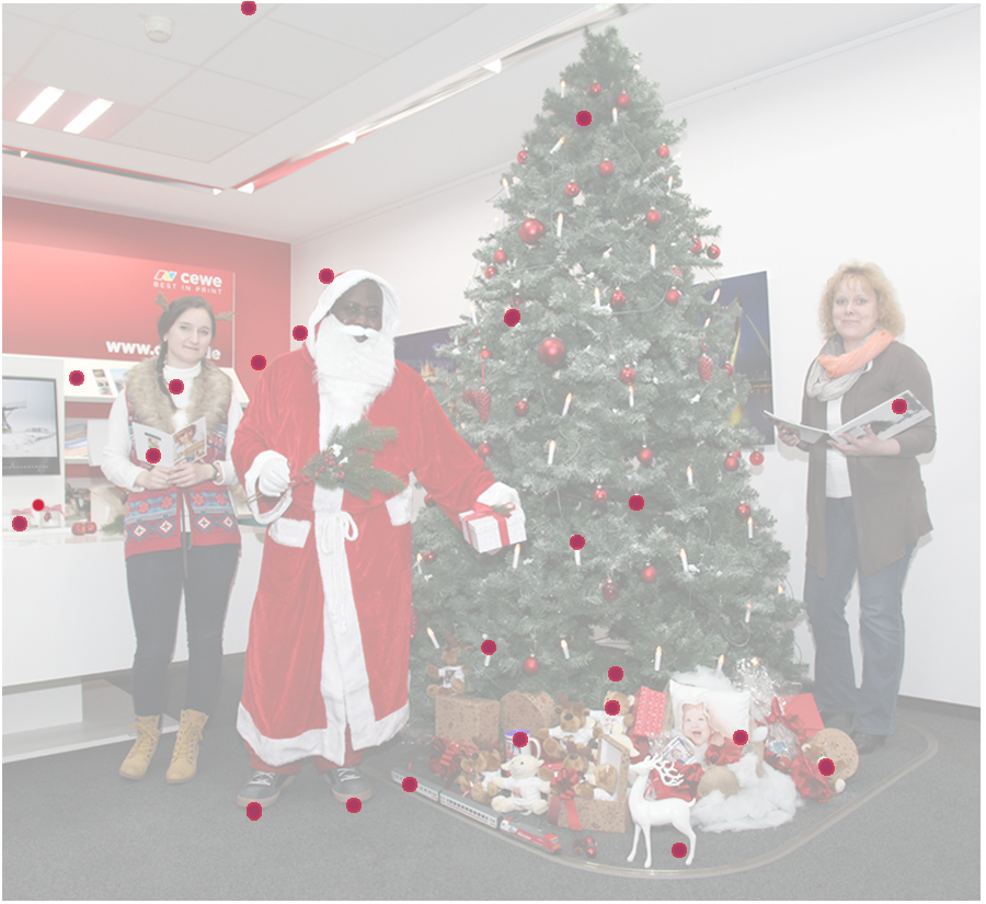 Links von Sonja: 1. Ist auf dem Bord das Kästchen mit rotem Band verdoppelt 2. Hinter dem verdoppelten Kästchen ist der schräg gestellte Deckel nicht mehr da 3. Auf dem obersten Regal fehlt ein Prospekt An Sonja: 4. Der untere Teil der Abbildung auf dem Prospekt in Sonjas Händen ist grün 5. Sonjas Halskette fehlt Am Weihnachtsmann: 6. Bommel oben zusätzlich 7. Bommel unten fehlt 8. Schuhsohle links nicht mehr grau 9. Schuhsohle rechts nicht mehr grau Zwischen Sonja und Weihnachtsmann: 10. Gelber Wuschel fehlt An der Decke: 11. Deckenfuge fehlt Am Weihnachtsbaum: 12. Im oberen Bereich ist eine Kugel lila statt rot 13. Auf Kopfhöhe ist eine Kerze grün statt weiß 14. Auf Handhöhe ist eine zusätzliche rote Weihnachtskugel 15. Schräg links darunter brennt die Kerze 16. Unter der Hand brennt eine Kerze 17. Über dem Bär fehlt eine Kerzenflamme Bei den Geschenken: 18. Am Zug fehlt auf dem hinteren Waggon der rote Strich/Beschriftung 19. Die Tasse ist innen blau statt rot 20. Die Schnauze des Bärs ist beigebraun statt greige 21. Ein hinteres Bein der weißen Tierfigur fehlt 22. Der Tannenzapfen vor dem Kissen fehlt 23. Der weiße Ärmel beim braunen Bär fehlt An Sylke: 24. Das rote (CEWE-Logo?)-Schild auf dem Buch in Sylkes Händen fehlt Allen Foristen und dem CEWE Team wünsche ich frohe Weihnachten und schöne Feiertage Liebe Grüße
