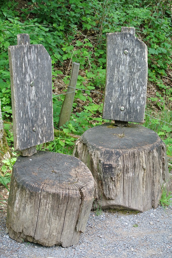 Re: Challenge 02/2018 • Sitzen gelassen!Diese beiden Sitzgelegenheiten gabs in Bad Mergentheim im Tierpark. Einer wie ein Rauswurfstuhl so schräg und alle beide könnten viel erzählen so wie sie aussahen.
