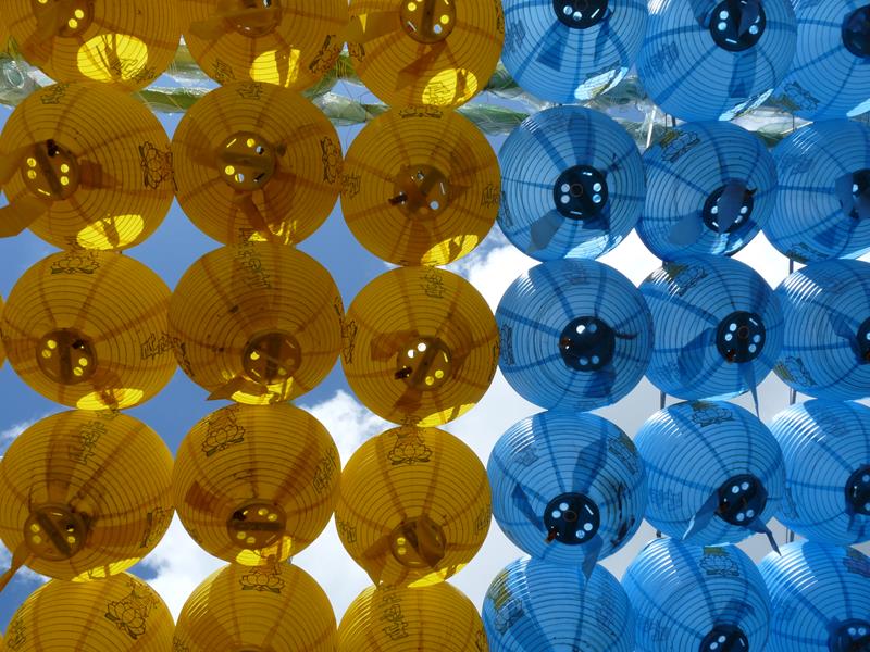 Ganz viele runde Lampions in einem Tempel in Südkorea