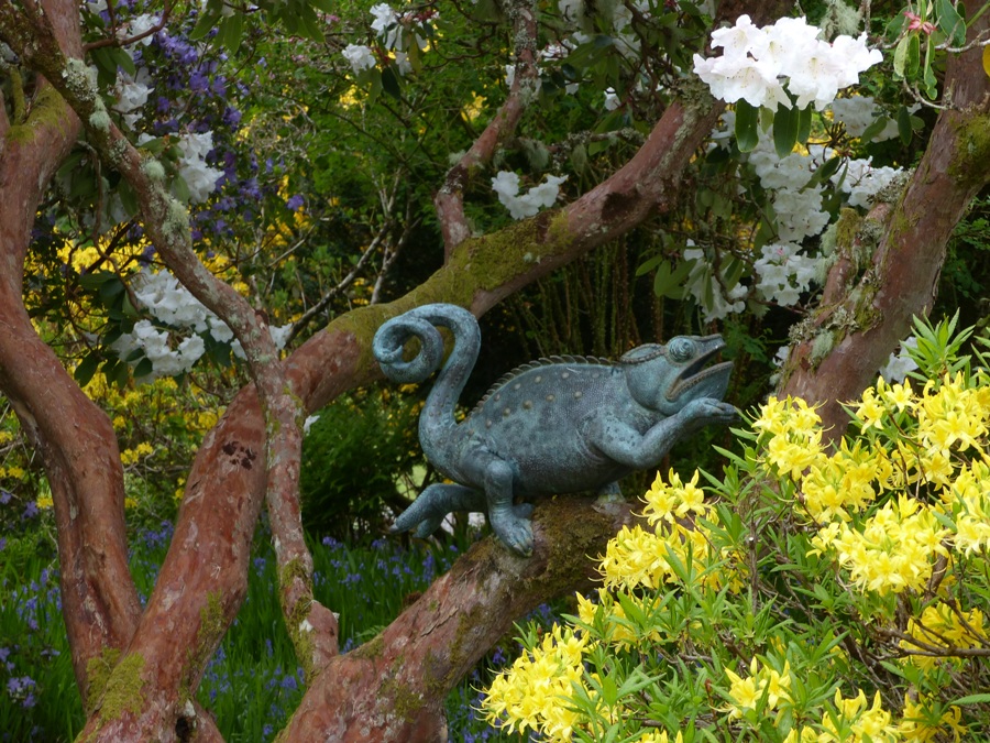Die Parkanlage in den Highlands beherbergt neben Wasser-, Küchen-, Kräuter- und Rhododendrongärten eine Kollektion an Skulpturen. Nicht nur königliche Herrschaften besuchten den Garten, sondern auch wir in diesem Jahr. Das an sich unbewegliche Chamäleon sieht aber so aus, als würde es sofort die Zunge heraus schnellen lassen. Lieber Gruß, pitty