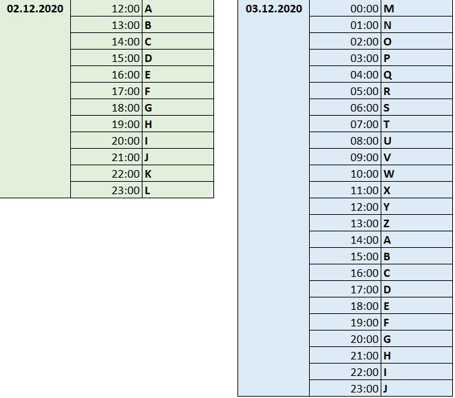 Aber zwischen 0.00 und 7.00 Uhr ist Pause, d.h. es geht morgen früh zwischen 7.00 und 8.00 Uhr weiter mit M und dann entsprechend verschoben weiter. Nachtarbeit ist nicht erforderlich! Ich kann leider nicht so eine schöne Tabelle machen Liebe Grüße Traumfänger Wer ist online?Mitglieder in diesem Forum: 0 Mitglieder und 100 Gäste