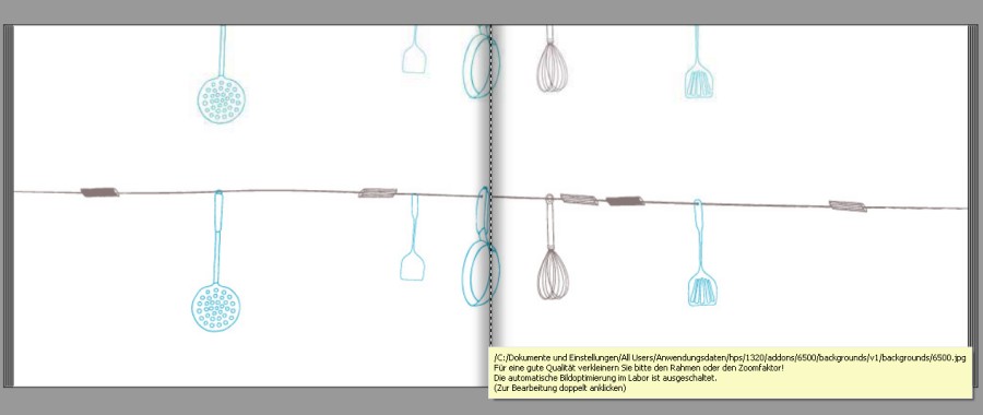 Re: Hintergrund Thema KochenIch hab's eben ausprobiert, die Koch-Hintergründe funktionieren wohl bei Querformaten nicht, die Motive sind angeschnitten, wie Du das auch beobachtet hast. Mir ist das nie aufgefallen, weil ich immer A4 Hochkant-Bücher gestalte. Vielleicht kannst Du Dir mit Cliparts behelfen. Die sind zwar auch nicht umwerfend, aber ein paar ganz nette sind dabei. Im Google sind auch noch viele Motive zu finden.