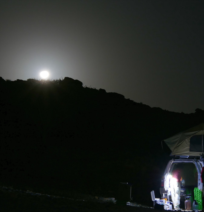 1. wir waren im Oman, dies hier ist nur ein E-Foto, zeigt aber, was wir davon sehen konnten, als der Mond endlich über den Hügel geklettert war, immerhin hat er eine kleine Beule!