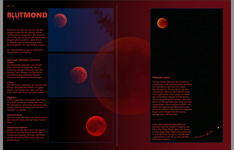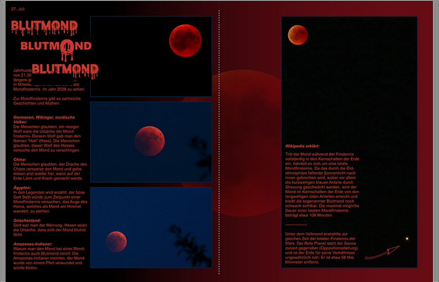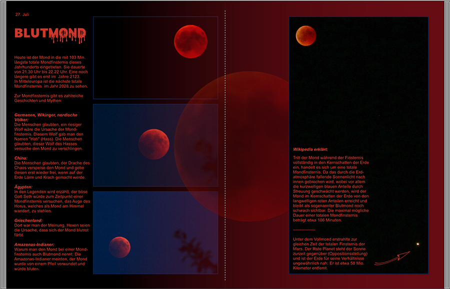 Re: MondfinsternisDanke für die Anregungen, ich werde mich heute Nachmittag nochmal dransetzen. Die Textfelder an sich sind links und rechts gleich breit. Das Foto mit Mond und Mars und dem schwarzen Himmel rechts habe ich in der Größe so angepasst, dass beide Himmelskörper gut zu sehen sind. Ich könnte es aber noch ein wenig schmaler machen und etwas weniger zoomen, dann würde der Mond aber weiter nach unten rutschen. Das ganze Foto mit Text könnte ich noch weiter an den Außenrand setzen. Sollte ich den Text rechtsbündig neben den Mond setzen? Ich lasse es jetzt mal so stehen und spiele gelegentlich noch ein bisschen rum.
