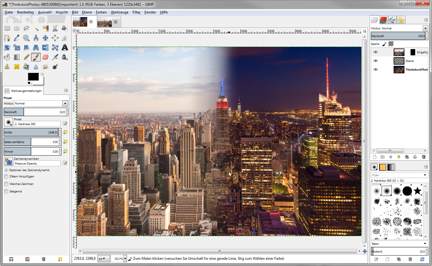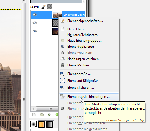 Motive sind vielseitig. Vor allem Städte zeigen sich bei Tag und nicht in vollkommen unterschiedlichen Gewand. Während am Morgen der weiche Himmel über der schlafenden Stadt hängt, erstrahlt Sie in der Nacht in bunten Farben. Jedes Motiv hat dabei seinen ganz eigenen Charme. Doch was geschieht, wenn man beide Motive kombiniert? Es entsteht ein spannendes Bild, das sich für unterschiedlichste Dinge wie Wandbilder oder auch CEWE FOTOBUCH Cover eignet. Gimp Zunächst öffnen Sie beide Bilder in Ihrem Programm. Bei einem der Bilder legen Sie nun eine neue leere Ebene ein. In Photoshop können Sie identisch arbeiten, da Sie hier ebenfalls mit dem Maskenmodus und zwei übereinandergelegten Bilder arbeiten können. Verwendungsideen Wenn Sie sich nicht für ein Motiv als Wandbild entscheiden können, dann kombinieren Sie einfach zwei miteinander. Dieses Transformationsbild sieht nicht nur digital toll aus, sondern auch an einer Wand in den eigenen vier Wänden. Da dieses Motiv keinen Moment sondern sogar eine Zeitspanne zeigt, eignet es sich auch hervorragend als Cover für ein CEWE FOTOBUCH. Natürlich könnten Sie dieses Motiv auch ganz nach Ihren eigenen Vorstellungen verwenden. Was sind Ihre Ideen? Diskutieren Sie mit uns in den Antworten über diese digitale Gestaltung von Fotos. Re: Vom Tag zur NachtInteressante Idee,