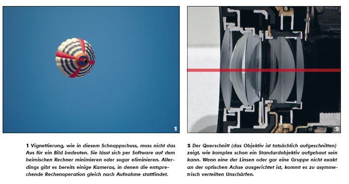 Vignettierung, oft auch als Randabschattung bezeichnet, sorgt dafür, dass die Bildränder und Bildecken dunkler ausfallen als die Bildmitte. Daran ist oft der innere Aufbau des Objektivs schuld, der die randnahen Lichtstrahlen blockiert. Diese Art der Vignettierung ist meist bei weit offenen Blenden zu beobachten und kann durch Abblenden um eine oder zwei Stufen minimiert oder schon eliminiert werden. Die eben beschriebene Vignettierung ist nicht zu verwechseln mit dem Randlichtabfall nach dem cos4-Gesetz. Es besagt, dass im Winkel einfallende Lichtstrahlen eine um den Faktor cos4 geringere Belichtung hervorrufen als senkrecht auftreffende Lichtstrahlen. Dieses Problem ist bei langbrennweitigen Objektiven weniger ausgeprägt als bei Superweitwinkel- und Weitwinkelobjektiven, bei denen die randnahen Lichtstrahlen schräg auf den Sensor treffen. Die Anordnung der Linsen vor der Blende kann dafür sorgen, dass die Eintrittspupille für schräg einfallende Lichtstrahlen größer und der Helligkeitsabfall zum Bildrand geringer wird. Zunehmend werden auch (nahezu) telezentrische Objektive entwickelt, bei denen auch randnahe Strahlen senkrecht auf den Sensor treffen. Durch den Einsatz geeigneter Software auf dem PC oder in der Kamera kann Helligkeitsabfall zwischen Bildmitte und Bildrand korrigiert werden.