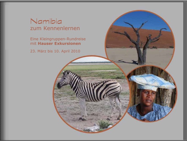 ich hatte ja bereits angekündigt, dass ich nur gegebenen Zeit mir Fragen daherkommen werden, und, liebe pitty, ich befürchte, der Zeitpunkt für die ersten Fragen ist gekommen. Die auf diesen Beitrag folgende Diskussion möge unter dem Aspekt der typografischen Regeln und Gesetzmäßigkeiten und deren Umfeld erfolgen; also bitte nicht beanstanden, dass die Fotos nicht gefallen, etc. Das wäre ein Thema an anderer Stelle. Zudem möchte ich Euch, vor allem Dich, pitty, an meinen Gedanken zu den gezeigten Seiten teilhaben lassen, bevor ich meine Fragen stelle. Zunächst also: Es wird ein Fotobuch über einen Namibia-Urlaub der stattfand im Jahre des Herrn 2010. Es war eine Rundreise mit dem Reiseveranstalter 'Hauser Exkursionen' und sie hat im März/April in einer Kleingruppe stattgefunden. So weit so gut. Vor dem genannten Hintergrund haben wir den Titel des Buches, die Bildschirmkopie zeigt es, schlicht gehalten. Bewusst schlicht gehalten, könnte ich hinzufügen. Nun war es unsere Intension, auf der ersten Seite die fehlenden Information zur Reise kundzutun, also Veranstalter (in dessen Kurzform, in der wir von ihm reden), Zeitpunkt der Reise, etc. Das nachfolgend eingefügte Bildschirmkopie zeigt, zu welchem Ergebnis wir bisher gelangt sind, und da setzt auch meine Frage auf und zwar ungeachtet der Tatsache, dass es ein Fotobuch nur für meine Frau und mich ist, also kaum die Gefahr besteht, dass es einer breiten Öffentlichkeit zugänglich ist. Dennoch kann man ja auch im privaten Bereich versuchen, so viel wie möglich richtig zu machen. Meine Frage also: Kann/darf man das so machen, oder ist das grundsätzlich völlig falsch? Sollte es nicht völlig falsch sein, ist es dann dennoch eher - sagen wir - suboptimal? Ich möchte mich an der Stelle für jedweden Vorschlag bedanken, der hilft, das Werk zu optimieren. Viele Grüße Gerhard PS: Möglicherweise wird es eine Änderung geben. Die betrifft die Schrift auf Seite eins. Der für den Titel eingesetzte Font ist gefällt uns zwar gut, ist aber nicht sehr gut lesbar. Möglicherweise weichen wir im Buch daher auf eine leichter lesbare Schrift aus (also auch nicht auf meine Handschrift. PS2: Und bitte auch keine Kommentare, dass das Lesen dieses Beitrags zu einem Deja-vu-Erlebnis führt. Ja, ich weiß... Abgekupfert. Gnadenlos.