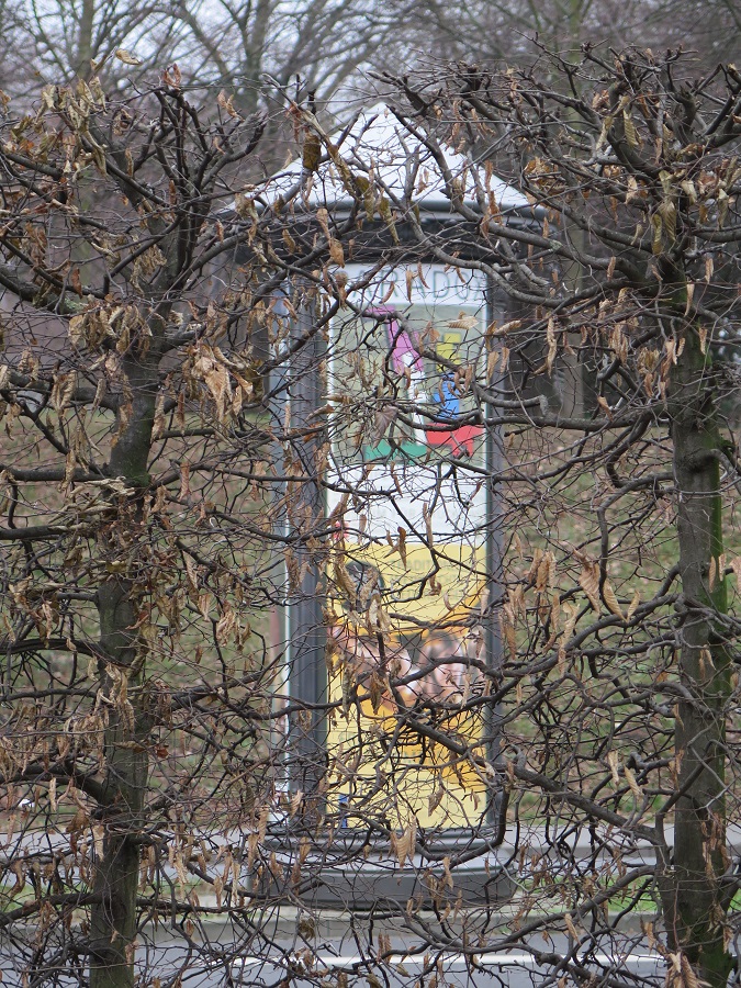 Zwei Blicke nach oben und zwei farbenfrohe durchs Gebüsch: