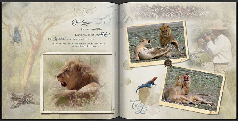 Weitere Seiten zeige ich euch gern. @inimu, eigentlich brauchst du nicht viel lernen, wie mir Bäuerin mal schrieb "...die Ideen kommen während des Gestaltens..). Ja wirklich das ist so, einmal angefangen entwickelt es sich fast von selbst und die Ideen ziehen gleich mit dem Spaß, den das Gestalten macht. Inzwischen nutze ich dazu freie Cliparts, gekaufte Vorlagen (eher wenig,- zu teuer) und selbstgemachten Vorlagen. Probier dich einfach mal aus. @Bäuerin, an der Schrift habe ich lange rumgefummelt bis sie die Leopardenmaske umspielt hat. Erst hatte ich sie auch linksbündig aber in der Gesamtansicht sah es dann rechtsbündig sehr viel schöner aus. Aber Klasse das es gut ankommt, schließlich warst du ja mein entscheidender Anstoß und Mutmacher so zu sagen, für das Buch. @Traumfäger, ein echtes Argument- hab ich bisher so nicht gesehen. Ein Denkanstoß auf jeden Fall. Ich werde mal eine Alternative probieren, mal sehen was draus wird. @spica50, Hmmmm Amarula! Der besagte Rahmen ist ein Komplettrahmen. Die Kleber konnte ich nicht verkleinern, aber ich war mir auch nicht ganz so schlüssig und hatte eine Alternativseite dazu. @urlaubsfan, der Rahmen ist einer von den käuflich erworbenen (bei Etsy), bei Kisspng finde ich aber auch immer freie Rahmen die gut passen. Aber die waren nicht sehr teuer, um die vier Euro (für mehrere Rahmen und Schatten). @DSL-schnell, das Thema Schrift scheint ja doch zu interessieren. Ich probiers mal! Manchmal ist die eigene Sicht ja nicht die optimalste. Hier noch weitere Seiten, einschließlich der Alternativseite (Klebestreifen) Liebe Grüße mokr. Re: auch SrapbookSehr, sehr schön, die neuen Seiten. Ich hoffe sehr, Du zeigst noch mehr oder sogar das ganze Buch...? Ich habe Deine anderen beiden Afrika-Bücher ja schon "verschlungen", aber durch diesen Gestaltungsstil ist dieses irgenwie... wilder, vergangener. Ich weiß nicht, wie ich es benennen soll. Da denke ich irgendwie an "Jenseits von Afrika" oder so...