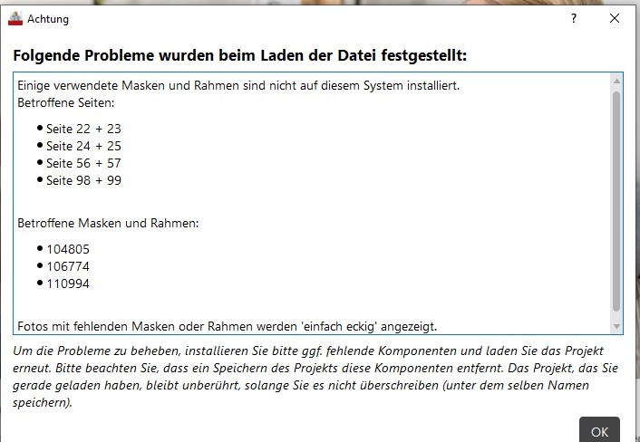 Versionsnummer: 7.0.2 Beschreibung: Durch den Tausch meines PCs musste ich die Cewe-Software neu installieren. Beim öffnen meines bereits begonnenen Buchs kam die Meldung, dass eine verwendete Masken und Rahmen auf dem System nicht installiert sind und diese nach neu zu geladen werden müssen. Das habe ich auch probiert. Leider erfolglos. Wenn ich Rahmen und Masken herunterladen möchte, bietet er mir nur noch Masken aber keine Rahmen mehr an. Ich habe auch versucht die Software neu zu installieren - das Problem bleibt. Im Downloadbereich sind keine Rahmen auffindbar. Kann mir jemand helfen? Re: Rahmen fehlenHallo dako,