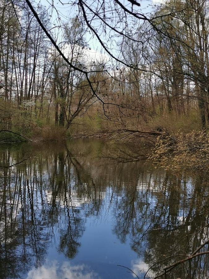 Icke hat mich eben auf eine Idee gebracht. Gestern Abend hatte mein Mann seinen 2. Impftermin und ich habe mir die Wartezeit mit einem kleinen Spaziergang vertrieben. Dabei sind mir diese Spiegeleien am Weiher aufgefallen, die ich durch ein paar Zweige fotografiert habe. Leider hatte ich nur mein Handy dabei...