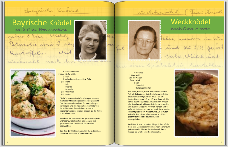Farblich finde ich es jetzt viel freundlicher und stimmiger. Was mich beim ersten Blick auf die Seiten ein wenig stört, sind die unterschiedlichen Abstände der beiden Portraits zur Buchmitte. Vielleicht die Überschriften einen Tick kleiner, dann kannst du das Foto links noch ein bisschen weiter nach links platzieren. Außerdem kommt mir vor, als ob "Bayerische" größer geschrieben ist, als "Knödel"?? Wenn die Schriftgröße dann passt, kannst du nochmal überprüfen, ob die Überschriften auf gleicher Höhe liegen. Momentan meine ich, dass es minimale Differenzen gibt. Die Überschrift rechts ist ein kleines bisschen höher platziert als die linke.