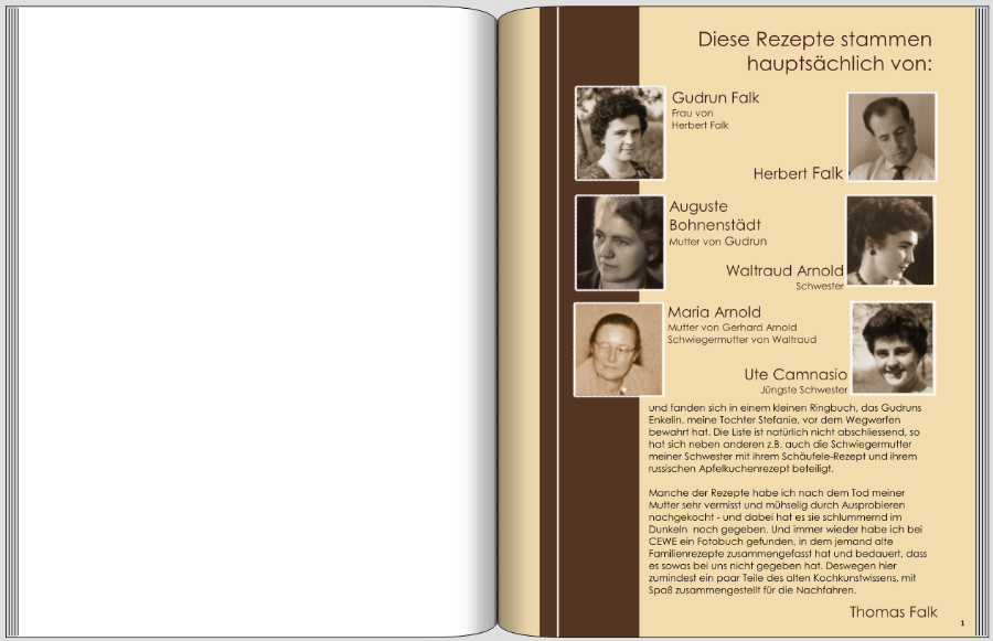 Liebe Silberdistel,Ich hoffe, dass du meine kleinliche Nörgelei nicht krumm nimmst. Es sind wirklich nur Kleinigkeiten. Einem Nicht-Fotobuch-Gestalter würde vermutlich überhaupt nichts auffallen. mit Bewunderung für Dein scharfes Auge habe ich die angesprochenen Punkte korrigiert, Du hattest natürlich recht. Das kommt auch daher, dass ich all dies (Schriftgröße, Abstände etc.) im Feinschliff erst ganz am Schluss nochmals prüfe, nach der abschließenden Rechtschreibprüfung - und beides macht meine Gattin dann auch nochmal. Und wir wissen, dass man trotzdem die letzten Fehler erst findet, wenn man das ausgedruckte Werk in Händen hält - deswegen ist das erst Exemplar immer für mich, verschenken an meine Schwestern und Enkel werde ich dann die nochmal korrigierte Form. Zum Thema Rezeptgeberin und Bild: Überlegt habe ich mir, dass überall da, wo dies meine Mutter ist, ein (immer wieder anderes) Bild von ihr verdeutlicht, dass es ein Rezept von ihr ist, schließlich heißt das Buch ja auch "Mamas Rezepte". Ich könnte natürlich einen Zusatz anbringen, beim Hirtentopf z.B. "Schweinebraten a la Mama", würde der Symetrie dienen, ist aber noch nicht endgültig entschieden. Und ich empfinde die ganzen Kommentare nie als Nörgelei, sondern als wirkliche Hilfe. Wie oben schon mal geschrieben habe ich ja noch nie mit externer Unterstützung ein Fotobuch gestaltet, ich finde es klasse, dass man sich so intensiv mit meinen Machwerken auseinandersetzt und wertvolle Tipps im Ergebnis dabei rauskommen!. Und da ich bei meiner Familienchronik noch ganz am Anfang bin, werde ich diese Hilfe dort vielleicht auch in Anspruch nehmen wollen - oder sogar müssen. LG