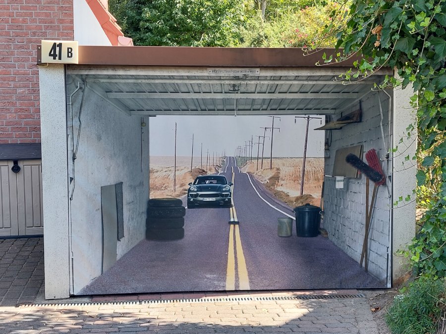Gerade wieder dran vorbeigegangen, ein wunderschön bemaltes Garagentor in unserer Nachbarschaft. Die Illusion der hinter der Garage weiterlaufenden Straße ist perfekt gelungen.