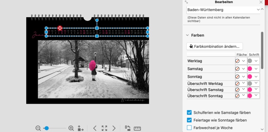meinst du das Rot im Kalendarium...dann schau mal hier / du klickst das Kalendarium an und dann kannst wie auf dem Foto die Farbe der einzelnen Tage einstellen