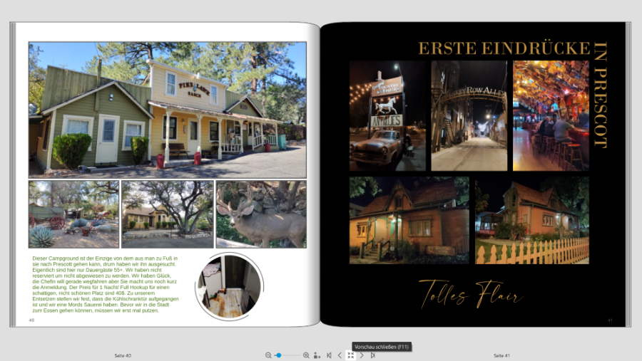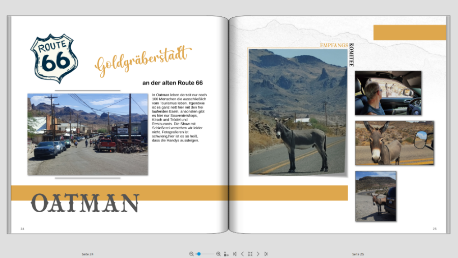 Ich bin mit meinem FB (Teil 1) von unserer Amerika Reise endlich in den letzten Zügen, jetzt kommt mein Mann daher und meint ich sollte doch unbedingt Fotopapier und dadurch Layflat machen. Jetzt hab ich logischerweise die Seiten so gestaltet, dass der Falz berücksichtigt wird. Also teilweise absichtlich mehr Abstand zum Falz. Bevor ich jetzt alles abändere, möchte ich bitte Eure Meinung dazu hören. Ich denke dass ich manche Seiten mit rel geringem Aufwand anpassen kann, aber bei anderen hab ich doch Bedenken dass es irgendwie "komisch" ausschaut. Ich häng Euch mal ein paar Seiten an damit Ihr einen Eindruck von meiner Gestaltung bekommt. jetzt kommen meine Problemseiten wenn ich auf Layflat wechsle Was sagt Ihr dazu? Würdet Ihr wechseln auf Fotopapier. Seitenzahl insgesamt momentan ca 130 Seiten. Das ist jetzt die Hälfte der Reise, Teil 2 fehlt noch komplett VG geniesser66