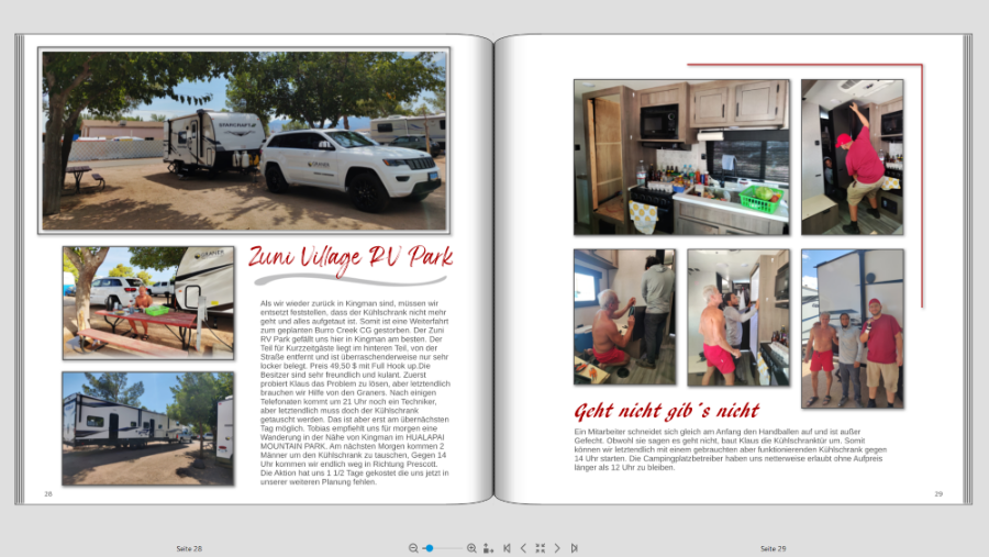 Ich bin mit meinem FB (Teil 1) von unserer Amerika Reise endlich in den letzten Zügen, jetzt kommt mein Mann daher und meint ich sollte doch unbedingt Fotopapier und dadurch Layflat machen. Jetzt hab ich logischerweise die Seiten so gestaltet, dass der Falz berücksichtigt wird. Also teilweise absichtlich mehr Abstand zum Falz. Bevor ich jetzt alles abändere, möchte ich bitte Eure Meinung dazu hören. Ich denke dass ich manche Seiten mit rel geringem Aufwand anpassen kann, aber bei anderen hab ich doch Bedenken dass es irgendwie "komisch" ausschaut. Ich häng Euch mal ein paar Seiten an damit Ihr einen Eindruck von meiner Gestaltung bekommt. jetzt kommen meine Problemseiten wenn ich auf Layflat wechsle Was sagt Ihr dazu? Würdet Ihr wechseln auf Fotopapier. Seitenzahl insgesamt momentan ca 130 Seiten. Das ist jetzt die Hälfte der Reise, Teil 2 fehlt noch komplett VG geniesser66