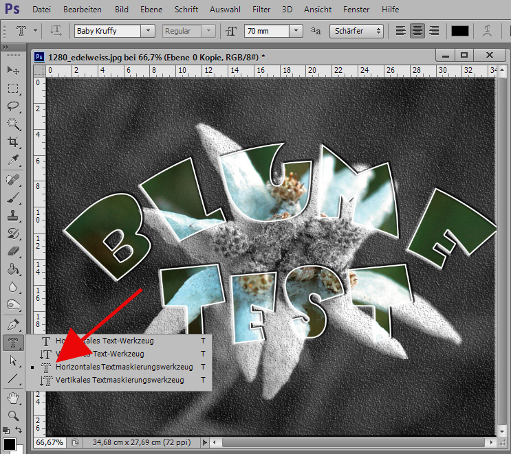 Mit PS geht es viel einfacher. Bild in Ebene umwandeln, dann Ebene kopieren. Die obere Ebene entweder aufhellen, in SW umwandeln, etc.... Dann mit dem „Horinzontalen Textmaskierwerkzeug“ den gewünschten Text erstellen. Die Textumrandung siehst du als „laufende Ameisen“, auf entfernen drücken, und schon siehst du die untere Ebene. Jetzt kannst du der oberen Ebene eine Struktur vergeben, Umrandung, Schatten Schein nach innen oder außen, Kanten geben,..... und das alles in einem Schritt. Dies funktioniert mit allen Fotoprogrammen, die Ebenen zulassen. Viel Spaß1. - Blumenbild geladen - Ebene dupliziert (=Hintergrund Kopie = 2. Ebene) 2. - 3. Ebene = Text in schwarz und eine Kontur von 10 PX in weiß 3. - die 2. Ebene (Hintergrundkopie) mit 30% weiß gefüllt 4. - mit dem Zauberstab das Schwarz der Buchstaben markiert, dass eine Auswahl entsteht. 5. - die Textebene mit der darunterliegenden Ebene verbunden. 6. - die markierten schwarzen Textteile mit der "Entf"-Taste gelöscht. 7. - alles auf Hintergundebene reduziert und als jpg gespeichert. So lange die Ebenen nicht verbunden sind, kann mit Text, Farbüberlagerung, Textrand ect. gespielt werden, bis das Ergebnis passt. Das ist vielleicht eine relativ einfache Möglichkeit der Umsetzung. ---------------------------------------------------