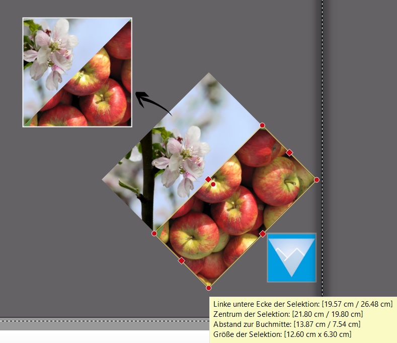 Wenn du es eilig hast, kann es je nach Foto aber über diesen Umweg klappen. Abhängig ist das vom Motiv, denn du musst dein Foto um 45° drehen:Die Form der Bilder lässt sich frei bestimmen. Lassen Sie sich überraschen! Du legst dein Foto nicht quadratisch, sondern im Verhältnis 2:1 an, beispielsweise 8 cm breit und 4 cm hoch. Dann drehst du es um 45° und gibst ihm die vorhandene Dreiecksmaske. Das zweite legst du mit der gegenläufigen Dreiecksmaske an und richtest die Fotos aneinander aus. Ich hab noch eine Farbfläche als Rand drunter gelegt. Ist ein bisschen fummelig. Mit der neuen Version wird es sicher einfacher. liebe Grüße