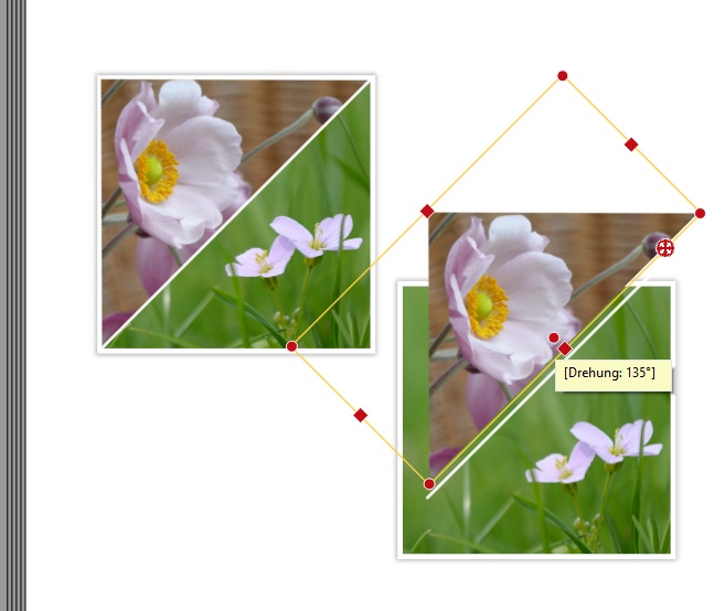 Einfacher ist es, zuerst beide Fotos untereinander zu legen und die entgegengesetzten Dreiecksmasken zuzuweisen. Dann mit gedrückter Strg-Taste beide Fotos anklicken und beide Fotos gemeinsam drehen. Liebe Grüße