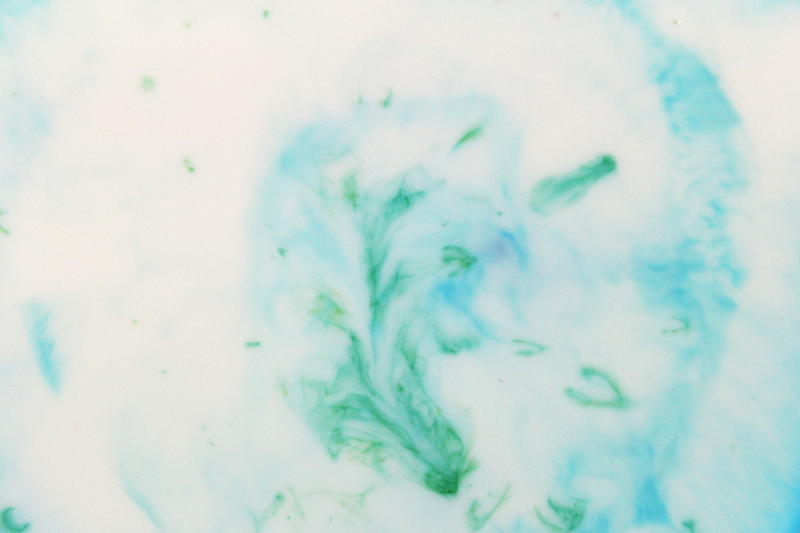 Sobald Sie bei Ihnen alles bereit steht können Sie beginnen. Füllen Sie zunächst Ihre Schale mit Milch. Nun verteilen Sie einige Spritzer Lebensmittelfarbe darin. Das Ende des Wattestäbchens tauchen Sie nun in Ihr Spühlmittel und anschließend in die Milch. Was Sie nun beobachten können, ist das Verlaufen der Farben in der Milch wodurch ein marmorierter Effekt entsteht.