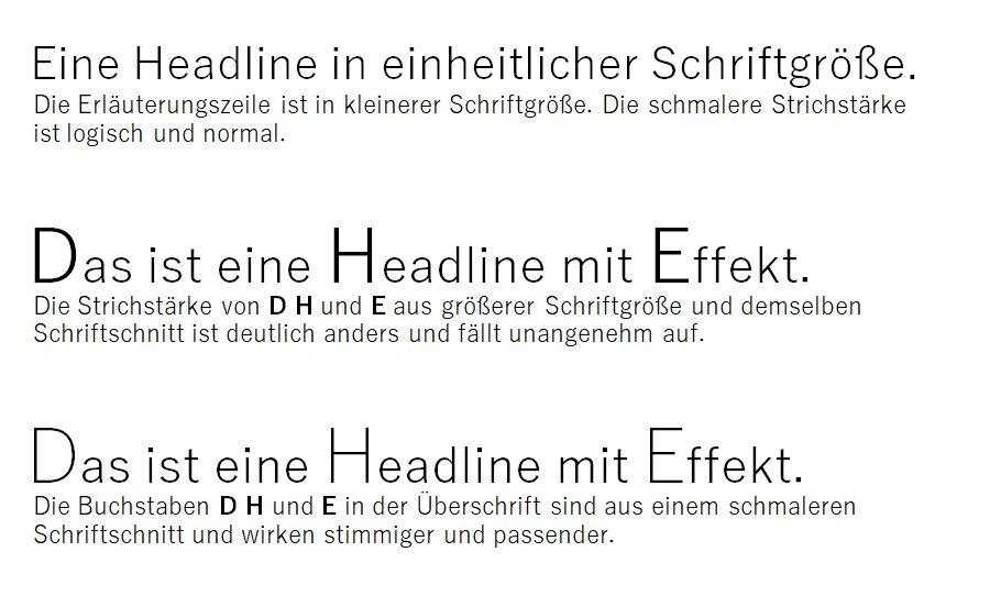 Das ist sehr mutig und nur bedingt zu empfehlen.Bei breiteren Schriften habe ich es schon so gemacht, dass ich den größeren Buchstaben einen Buchstabenrand in Hintergrundfarbe gegeben habe, wenn der einfarbig war. Beides kann gut funktionieren. Ich rate sowieso von dieser Art der grundlosen Effekthascherei ab. Man sollte nicht an Schriften herumfummeln. Schon aus Respekt den Schriftgestaltern gegenüber und auch wegen der Lesefreundlichkeit. Wenn es denn unbedingt sein muss und man wirklich keine anderen Ideen hat, dann so, dass man aus derselben Schrift einen schmaleren Schnitt verwendet. In meinem Beispiel habe ich einen normalen und einen Light-Schnitt verwendet: Lieber Gruß, pitty