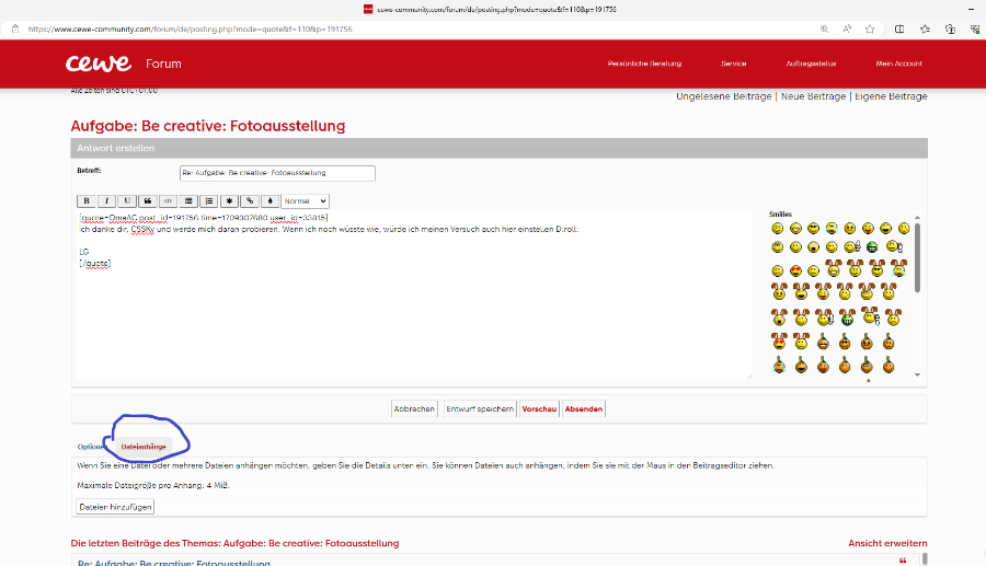 Den oben beschriebenen Weg mit "Strg" und "Drucken" habe ich noch nicht ausprobiert, sieht für mich nach einem Umweg aus. Ich arbeite mit Windows, der Weg erscheint mir einfacher. Man muss lediglich die Windows-Taste zusammen mit "Drucken" betätigen. Es wird der Screenshot direkt im Windows-Ordner "Bildschirmfotos" gespeichert. Von da aus kannst du die Datei weiter bearbeiten bzw. in deinen Post einfügen und musst nichts mehr kopieren, einfügen und speichern.anhang.png Ein Bildschirmfoto von deiner Gestaltung machst du am besten, in dem und die Vorschau anzeigen lässt und dann die Tasten "Strg" und "Drucken" gleichzeig betätigst. Das Bild dann mit "Strg+c" kopieren und z.B. in "paint" mit "Strg+v" einfügen und speichern. Dann hier einfügen. Dazu steht dann unten eine Schaltfläche: Im Beitrag anzeigen. Wenn noch weitere Fragen hast, immer gerne. Viel Erfolg! Lieber Gruß Traumfänger Re: Aufgabe: Be creative: FotoausstellungDanke, Traumfänger, es hat funktioniert, siehe Ideenfindung