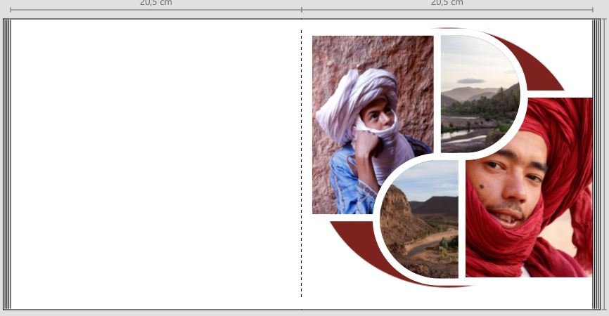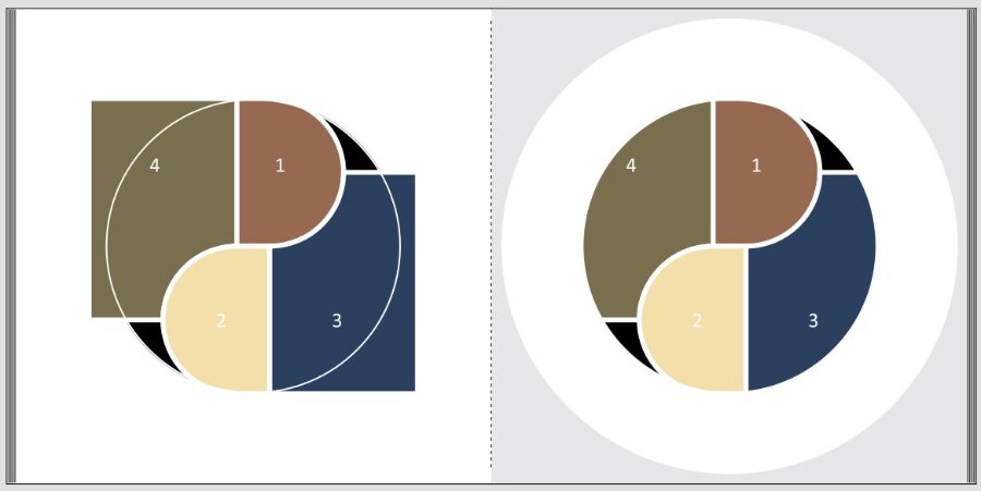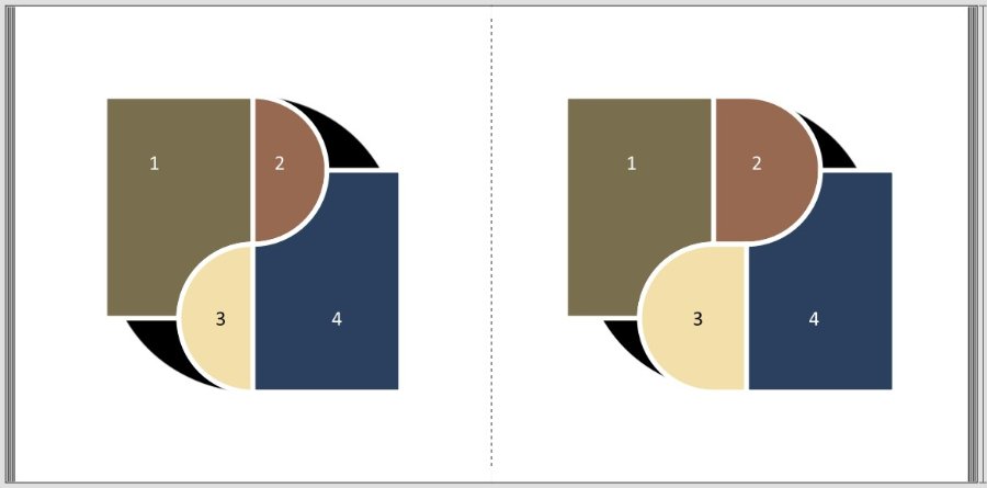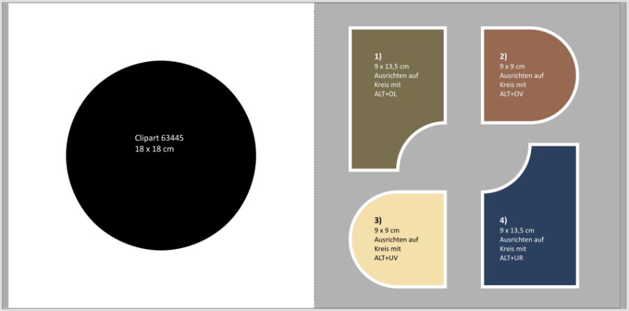 Ich habe wie folgt gearbeitet: --> Clipart Kreis als Basis und Hintergrund für die beiden sichtbaren einfarbigen Zipfel auf der Seite platziert --> 4 Fotoplatzhalter angelegt, wie im Screenshot dargestellt. Die Berechnung dazu: Die Quadrate mit Halbkreis erhalten das halbe Seitenmaß vom Kreisclipart, die Rechtecke mit Innenrundung erhalten die Breite der Quadrate und eine 1,5fache Länge von ihrer eigenen Breite. Die Rundungen lege ich generell mit 500 mm; das passt bei jeglicher Fotogröße (auch seitenfüllend), um eine vollständige Rundung zu erhalten. --> Alle 4 Fotoplatzhalter erhalten einen Rahmen Mitte, in meinem Beispiel 3mm. So kann ich die Fotos direkt aneinander andocken und die Rahmen überlappen sich gleichmäßig. --> Die 4 Fotoplatzhalter befülle ich und richte sie mit den jeweils angegebenen Tastenkombis (ALT+OV usw.) auf dem Kreis aus. Dazu markiere ich jeweils zuerst den Kreis, halte STRG gedrückt und markiere dann den jeweiligen Fotoplatzhalter. (Abb. li.) --> Die von Sylke gezeigte versetzte Optik erhalte ich, indem ich die Fotos anschließend verschiebe. Für mein Beispiel habe ich bei gedrückter STRG-Taste 2 und 4 gemeinsam markiert mit der Pfeiltaste 10x nach rechts sowie 1 und 3 gemeinsam markiert mit der Pfeiltaste 10x nach links geklickt. (Abb. re.) Die Schnecke im Yin und Yang Design geht grundsätzlich im Ansatz gleich, nur die Ausrichtung der Fotos und Rundungen ist anders. (Abb. li) Für den Basiskreis nehme ich hier jedoch ein vollständig gerundetes Foto statt des Cliparts, um evtl. Farbabweichungen beim Druck zu vermeiden, die teilweise zwischen Fotos und Cliparts vorkommen. Bei Yin Yang lasse ich auch die Rahmen und die seitwärtigen Verschiebungen weg, sodass die einzelnen Fotos am Ende wie nur 2 aussehen. Das Kreisfoto im Hintergrund sowie die Fotos 3 und 4 werden alle mit einem identischen einfarbigen Foto bestückt. Den Zipfel unten rechts decke ich mit einem zusätzlichen Clipart ab, dessen Farbe ich aus dem anliegenden Bereich des Fotos 2 picke. Fotoplatzhalter 1 und 2 bestücke ich jeweils mit dem gleichen Foto und richte diese so aus, dass sie passen und wie ein Foto aussehen. Foto 2 erhält außerdem einen Verlauf nach unten, um den Übergang zum darunterliegenden Clipart weicher zu gestalten. (Abb re.) Liebe Grüße
