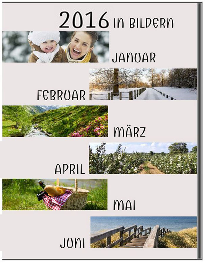 Die zweite Gestaltung zeigt, dass ein Inhaltsverzeichnis auch ohne Bilder funktionieren kann. Ich habe hier bewusst verschieden geformte Cliparts gewählt und diese wild durcheinander angeordnet. Auch diese Art von Gestaltung kann spannend wirken. Dadurch, dass die Monate nicht in der richtigen Reihenfolge angeordnet sind, wird das Ganze zu einem kleinen Ratespiel, ähnlich wie bei einem Adventskalender. D:wink: