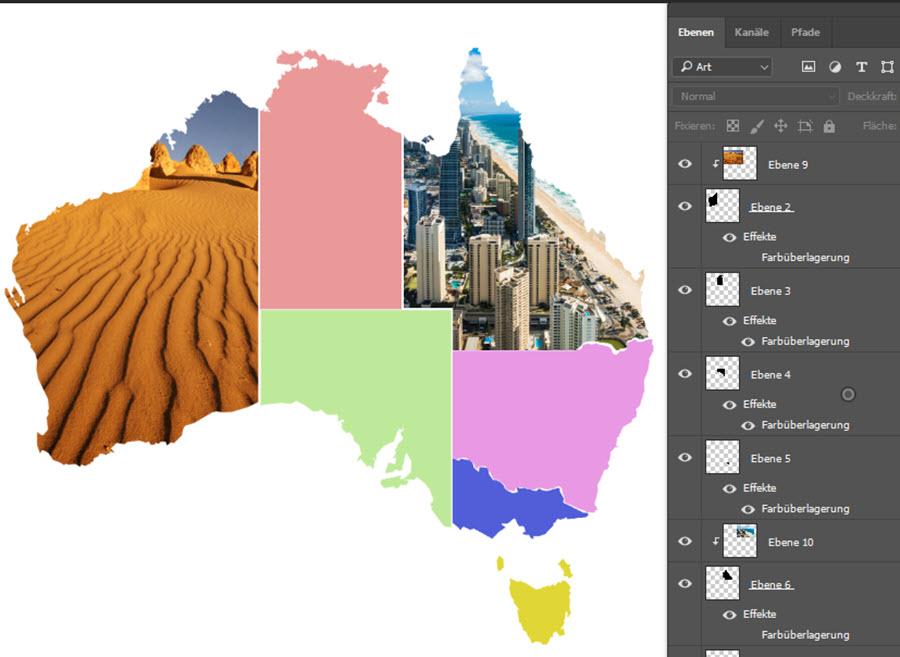 Wenn du Zugriff auf eine Software hast, die Ebenen und Masken verwaltet, dann geht das ganz einfach. Allerdings würde ich Australien in die verschieden Staaten teilen und nicht irgendwie.Hier ein schnelles Beispiel: Seid ihr M & P von der Englandreise, ich kenne doch euer Maskottchen --------------------------------------------------- Re: Landkarte mit FotomotivenHallo walkabout2012,