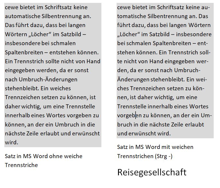 Nun kopiere ich den Text von MS Word, der dort mit weichem Divis gesetzt wurde, mit copy-paste in cewe und es funktioniert ebenso. Es werden weitere Steuerungsmerkmale mit kopiert - in diesem Beispiel auch die hier unerwünschte graue Hinterlegung.