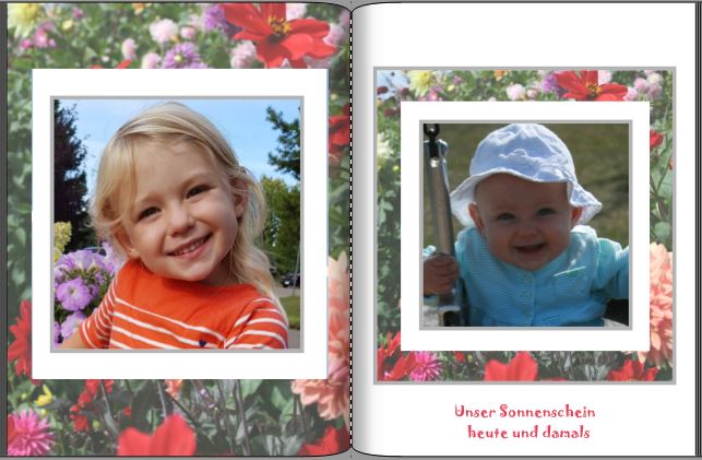 Angefangen habe ich mit dem Foto meiner Tochter auf der linken Seite. Dieses wollte ich besonders herausstellen und habe daher als Seitenhintergrund ein Blumen Detailfoto aus meiner Fotosammlung verwendet.