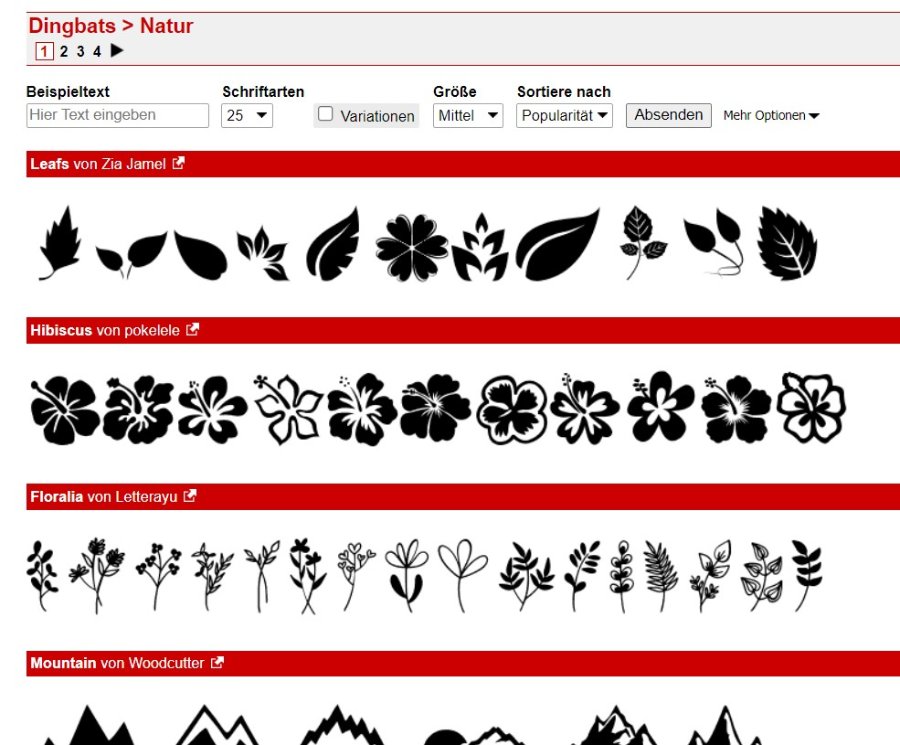 Kann man diesen Thread in den Gestaltungsbereich verschieben? Hier geht er unter und kann nur von eingeloggten Forenmitgliedern gelesen werden. Das ist schade. Dankeschön! @Caro290: Es gibt auch Schriftarten, die bereits floral gestaltet sind. Ich stöbere gerne auf dafont.com. In der Kategorie Extravagant --> Dekorativ wirst Du hierzu fündig. Hier ein Beispiel: Oder Du schaust Dich auf der selben Seite bei Dingbats --> Natur um. Das sind Bilder als "Schriften", welche Du somit auch auf anderen Schriften platzieren kannst. Vielleicht sind das auch Optionen für Deine Gestaltungsidee. Liebe Grüße