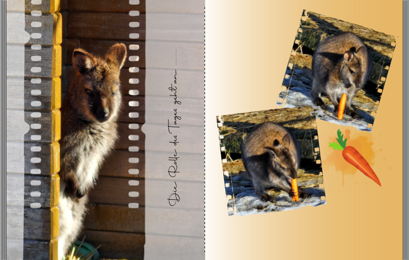 ich möchte die Idee wieder aufleben lassen und stelle einfach mal eine kreative Aufgabe. Be creative! Haben Sie schon einmal eine Fotoausstellung besucht? Trauen Sie sich an diese Aufgabe und gestalten Sie eine Doppelseite mit Rahmen aus der Kategorie "Film" ODER Bildern im Polaroid-Stil. Hängen Sie die Screenshots bitte diesem Beitrag an. Hier mal mein Beispiel dazu: Bin gespannt auf viele kreative Vorschläge. Viele Grüße CSSky
