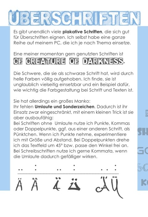 Ich setze ebenfalls Punkte, Kommata und Doppelpunkte ein, um Umlaute in plakativen Schriften zu kreieren, wenn ich eine besondere Schrift unbedingt verwenden will. Manchmal passen die Satzzeichen der Schrift, manchmal greife ich aber auch auf Zeichen aus anderen Schriften zurück. Punkte, Doppelpunkte und Kommata geben in der Regel ein jeweils anderes Bild und man kann sich aussuchen, was am besten passt. Hier ein Beispiel aus meinem Anleitungsheft. liebe Grüße