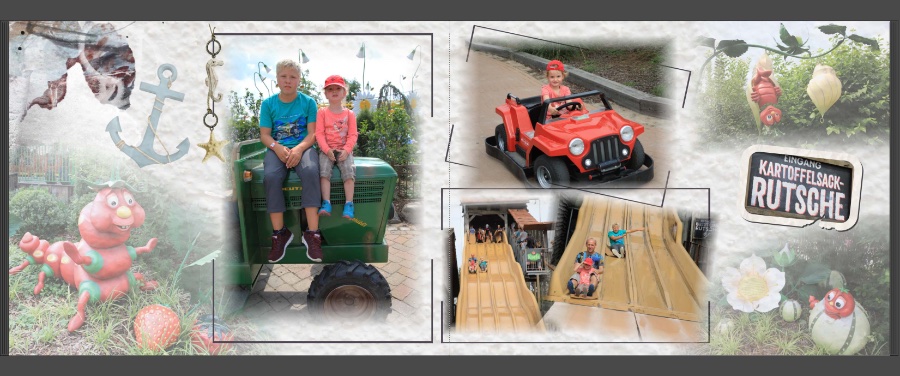 ich arbeite immer noch an meinem Fotobuch im Scrapbook Stil. Ich bin mit den zwei Seiten noch nicht so zufrieden und brauche mal eure Meinung dazu. Bei der ersten Doppelseite habe ich diese schwarzen Rahmen Obj. 128354 gewählt. Bei dem schräg gestellten Objekt (Auto mit meiner Tochter) gefällt mir nicht dass die untere Ecke in dem anderen Rahmen rein läuft. Krieg ich die irgendwie weg? Oder gibt es ein Clipart wie Obj. 129154 aber der Strich dünner? Dann könnte ich ja nur drei Ecken um das Bild legen. Ich hoffe Ihr versteht was ich meine und mir es vorstelle. Oder habt ihr eine ganz andere Idee? Bei der zweiten Doppelseite fehlt mir noch irgend etwas, sagt mein Bauch, aber ich kann nicht beschreiben was mir fehlt. Sagt mir mal bitte eure Meinung. Liebe Grüße Isabel Re: Gestaltung Fotobuch im Scrapbook StyleZur zweiten Seite: